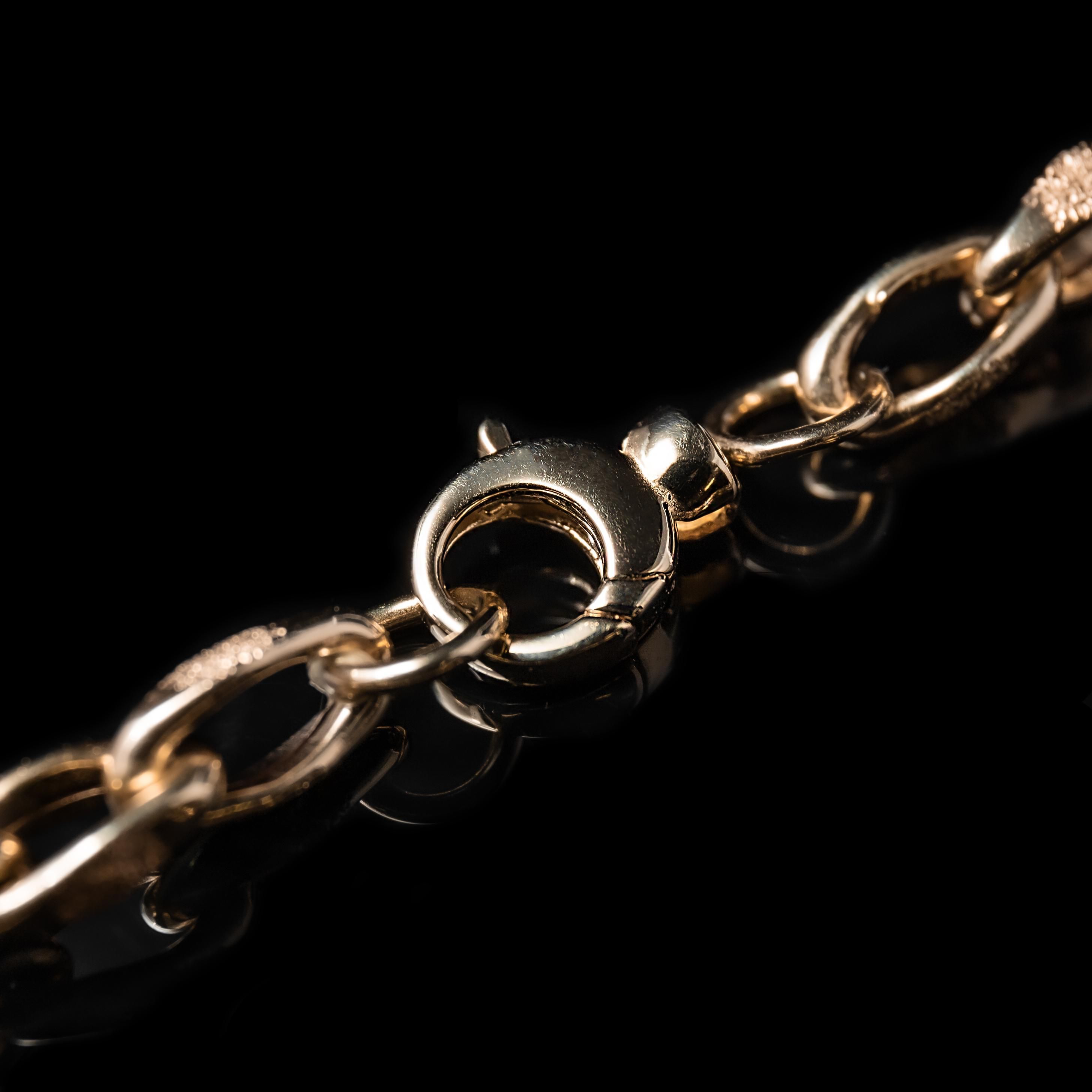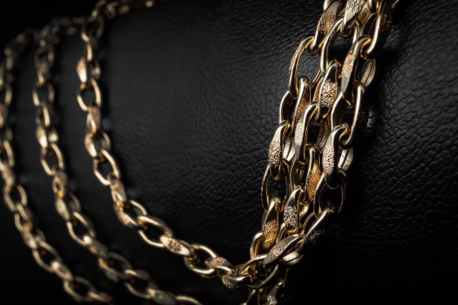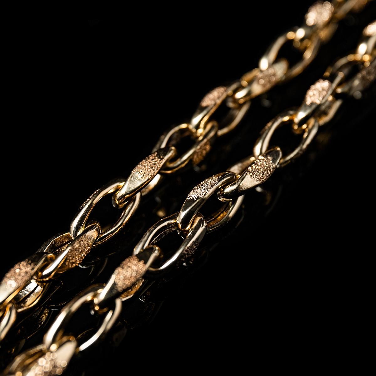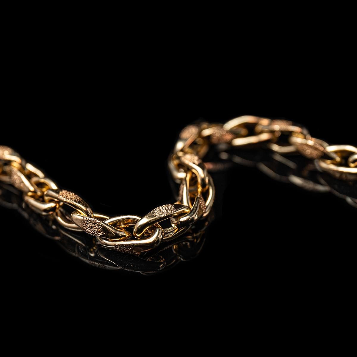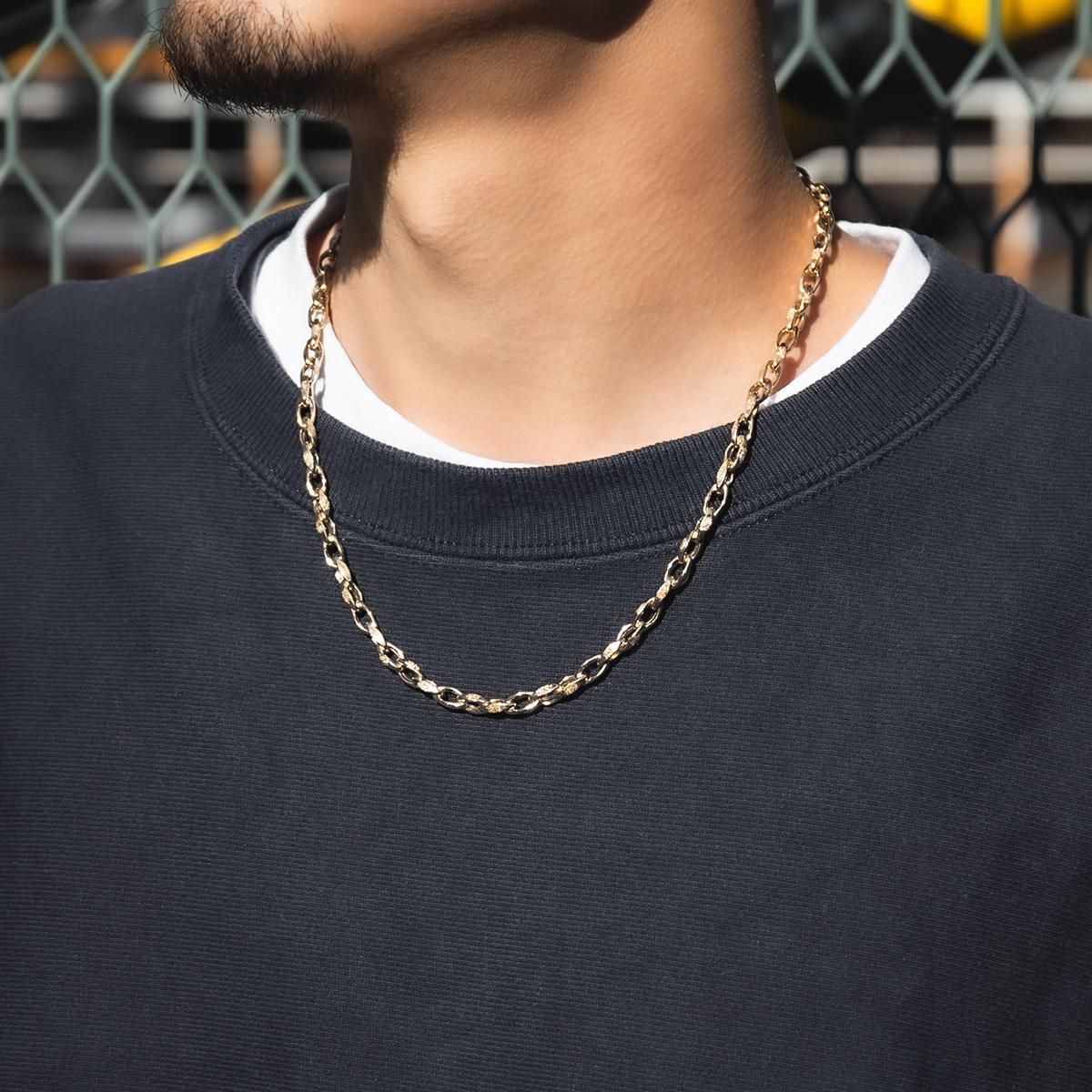 アズキやクロスケーブルと称されるデザインに近いベーシックで立体感のある鎖が、煌びやかな表面加工とは対照的な落ち着きのある印象があり、形状が緩やかにねじられている事により流れるような美しい輝きを生み出しています。