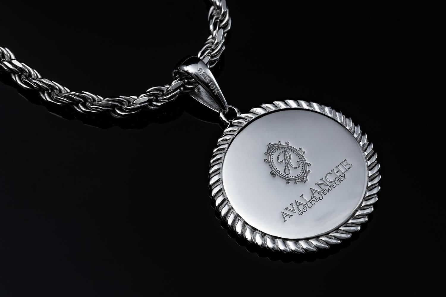 ヴィンテージ感溢れるエンジェルデザインのペンダント。縁をロープデザインにして、丸型の額縁の様なデザインに仕上げています。裏面にはアヴァランチのロゴを刻印した、オリジナルデザインのペンダントです。