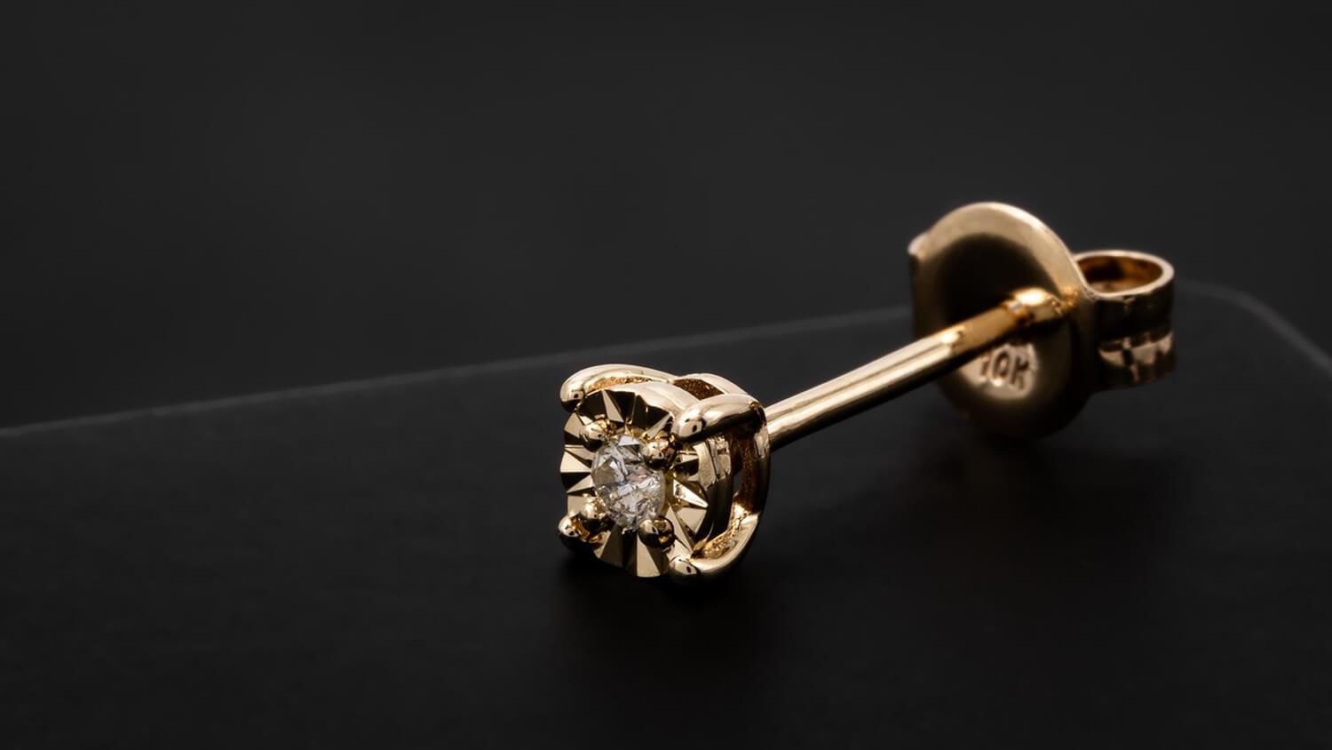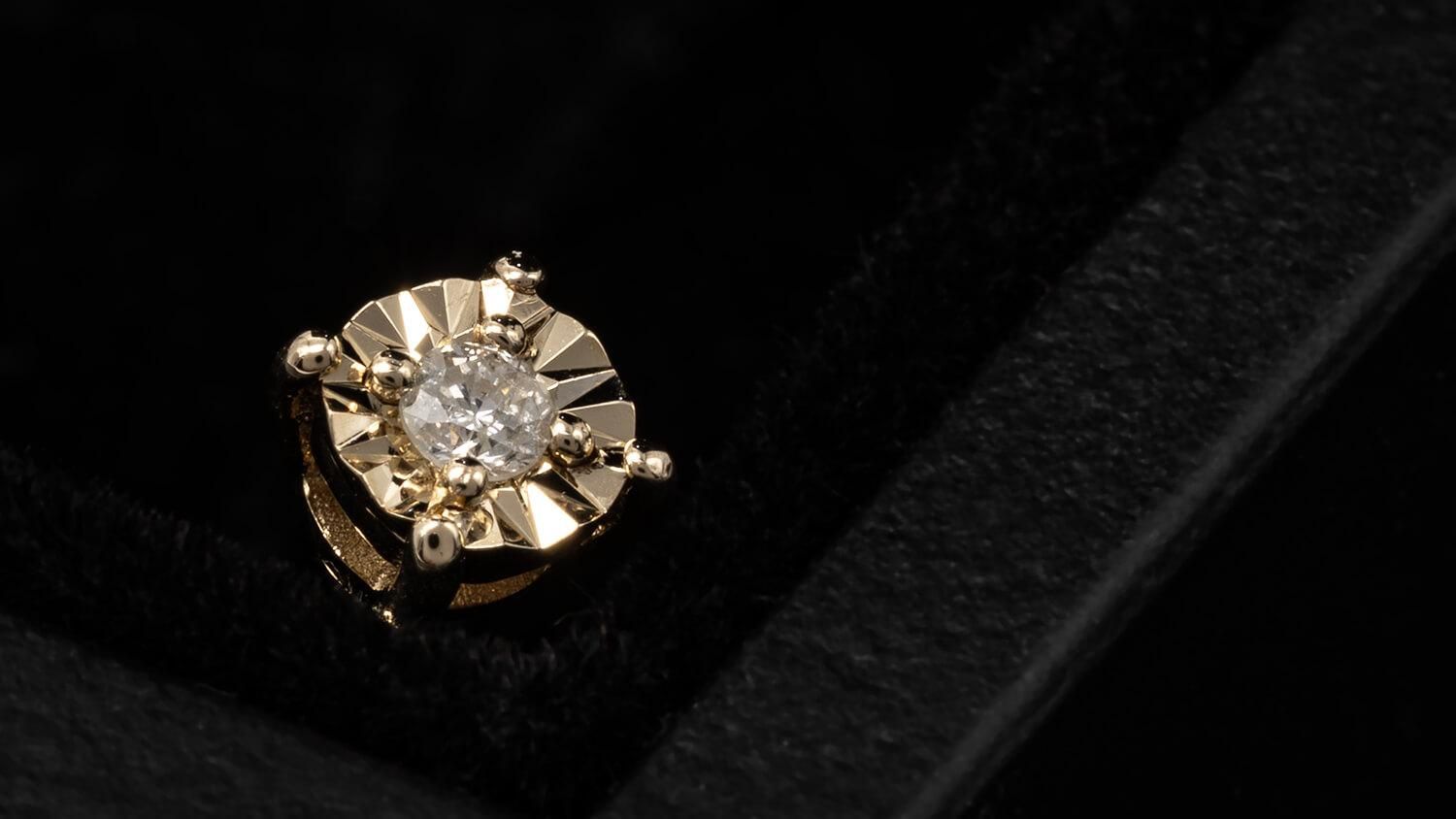 ダイヤモンドの周りにカットを施したイエローゴールドピアス。シンプルなデザインで耳元に上品な印象を与えます。