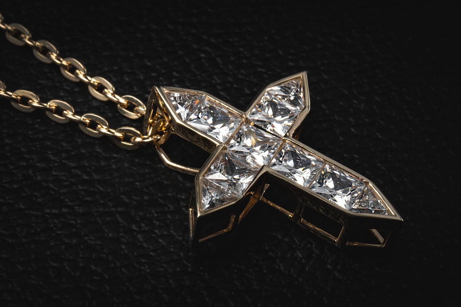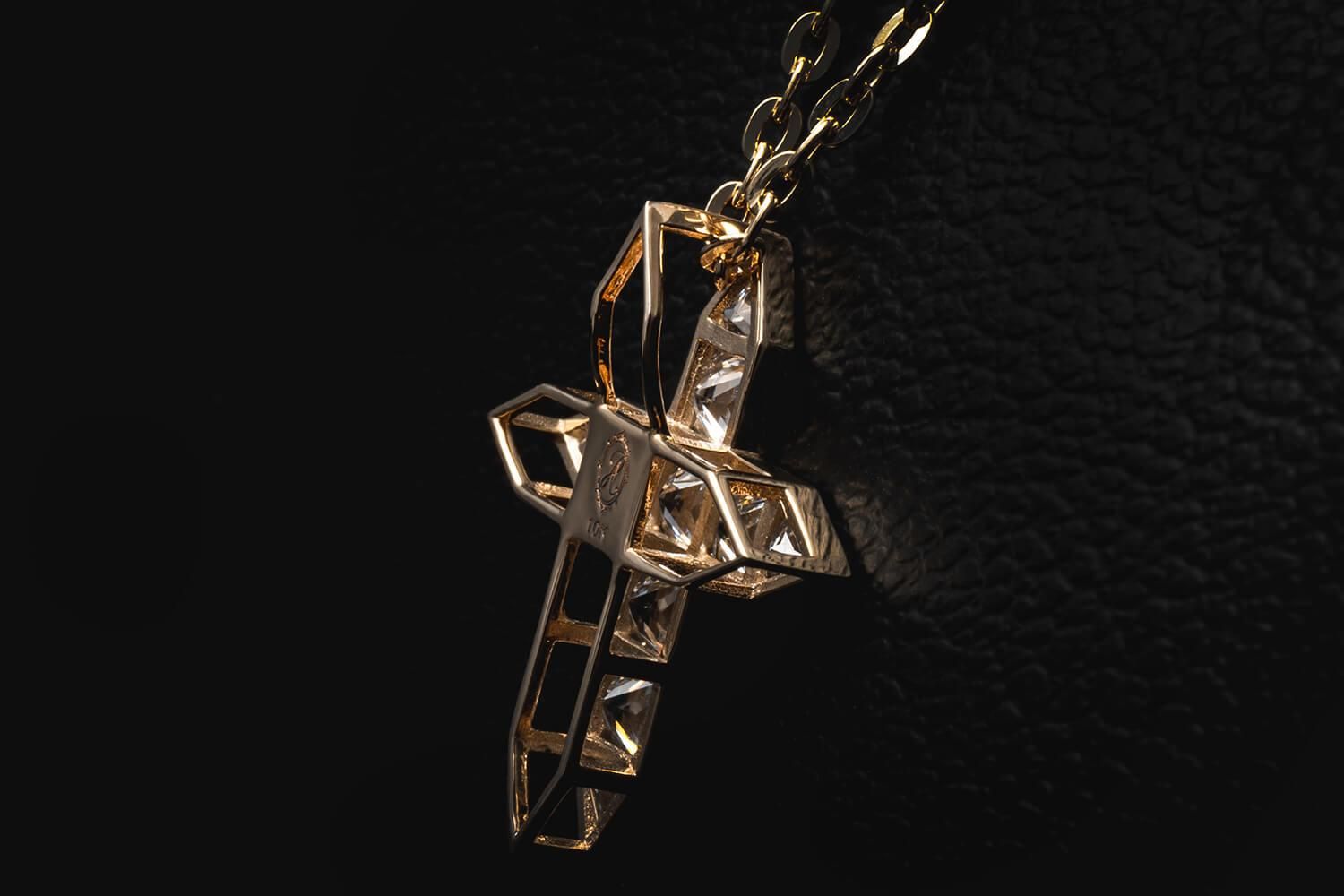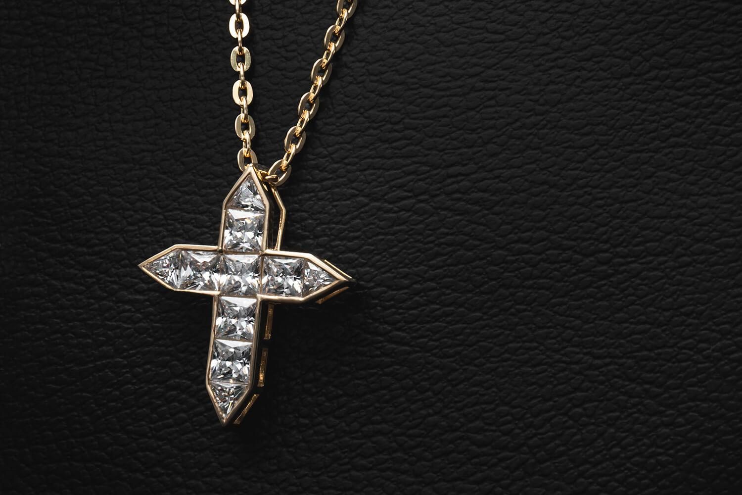 一面に大粒のジルコニアをセットしたクロスモチーフのペンダント。シンプルなデザインに映えるジルコニアの輝きが魅力の逸品です。様々なファッションにも相性抜群のジュエリーです。