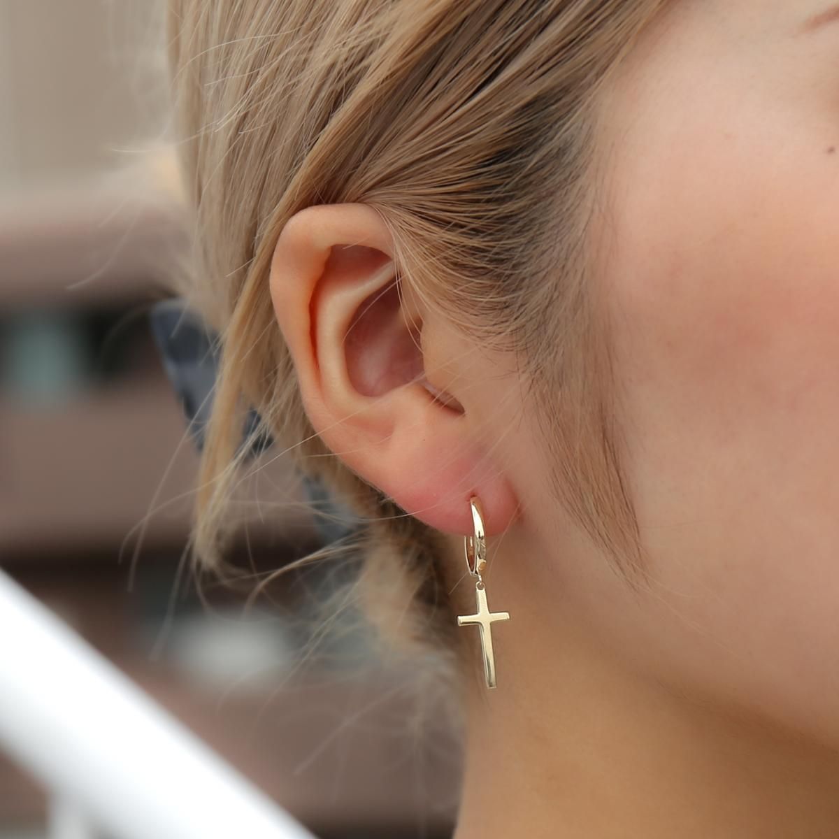 様々なファッションと合わせやすい小振りなフープピアスに、クロスデザインのチャームを合わせたピアス。通常のピアスとは一味違ったお洒落なピアスです。