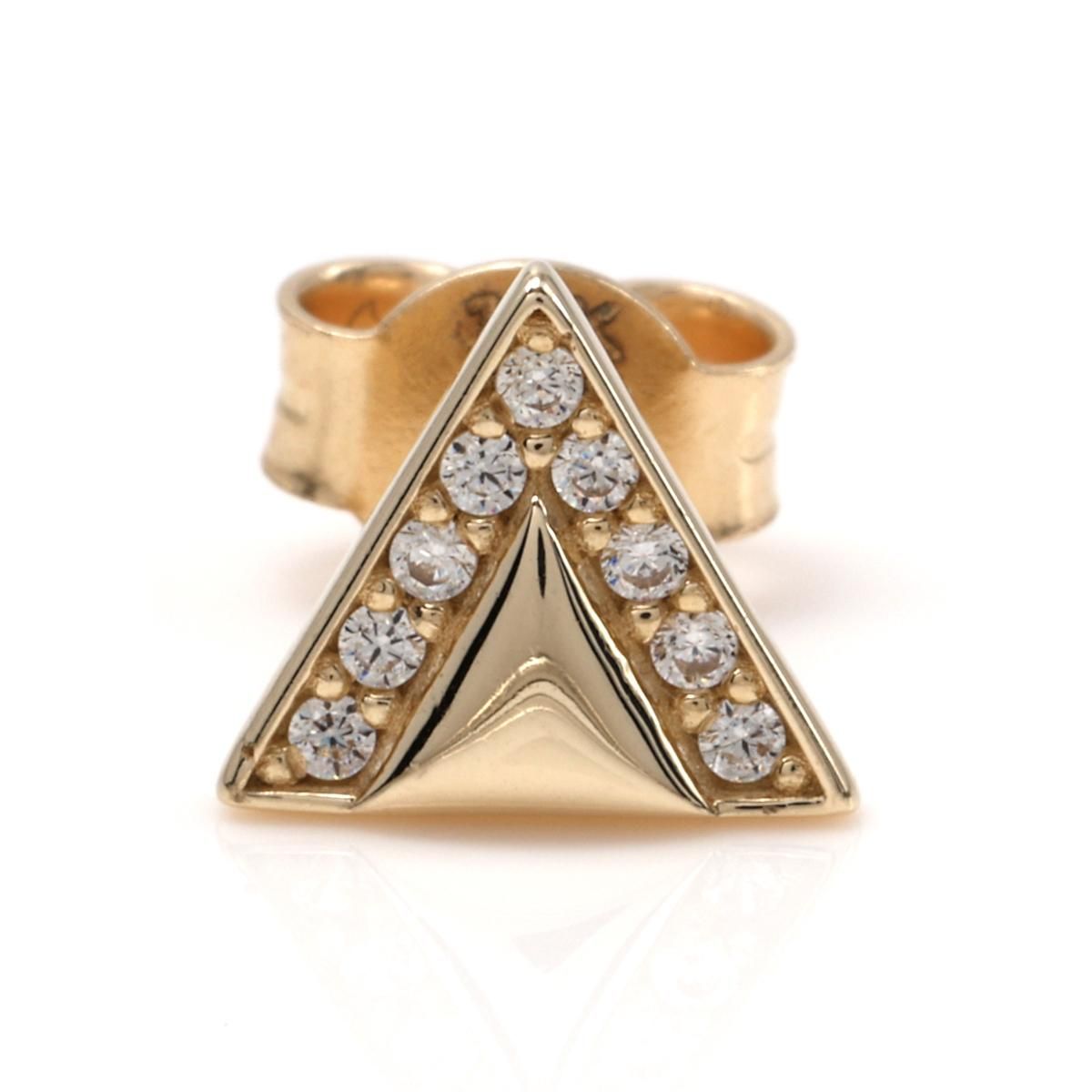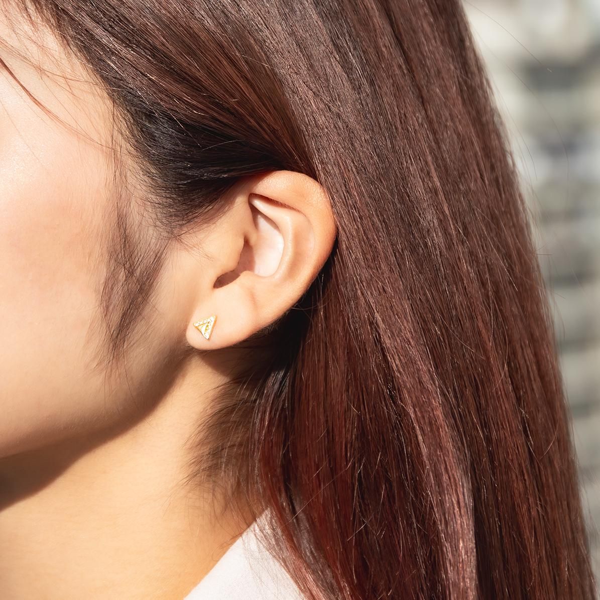 トライアングルタイプのジルコニアをセットしたイエローゴールドピアス。シャープでスタイリッシュなデザインで、耳元での輝き、存在感は共に抜群です。シンプルなデザインなので、様々なファッションにも合わせやすい逸品です。