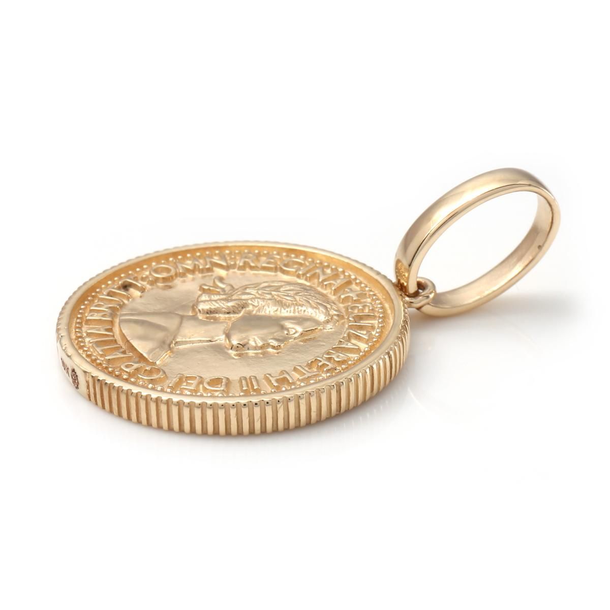 6ペンスコインデザインのペンダント。6ペンスコインとは、イギリスで1551年から1971年まで製造されていた硬貨のことで、1971年に製造が中止され現在ではなかなか見かけることが少なくなってきたことから、幻の6ペンスとも呼ばれているコインです。6ペンスコインには、歴代の王や女王が刻印され、製造年数によってデザインが異なり、中でも最も人気なデザインが、1953年〜1967年に製造されていたエリザベス2世が刻印されたこのデザインになります。結婚式で、花嫁の左の靴の中にこの6ペンスコインを入れておくと、その花嫁さんは幸せな一生を送ることができると、イギリスでは言い伝えられていることから"幸運の6ペンス"とも呼ばれ、ラッキーアイテムとして人々に愛され続けています。