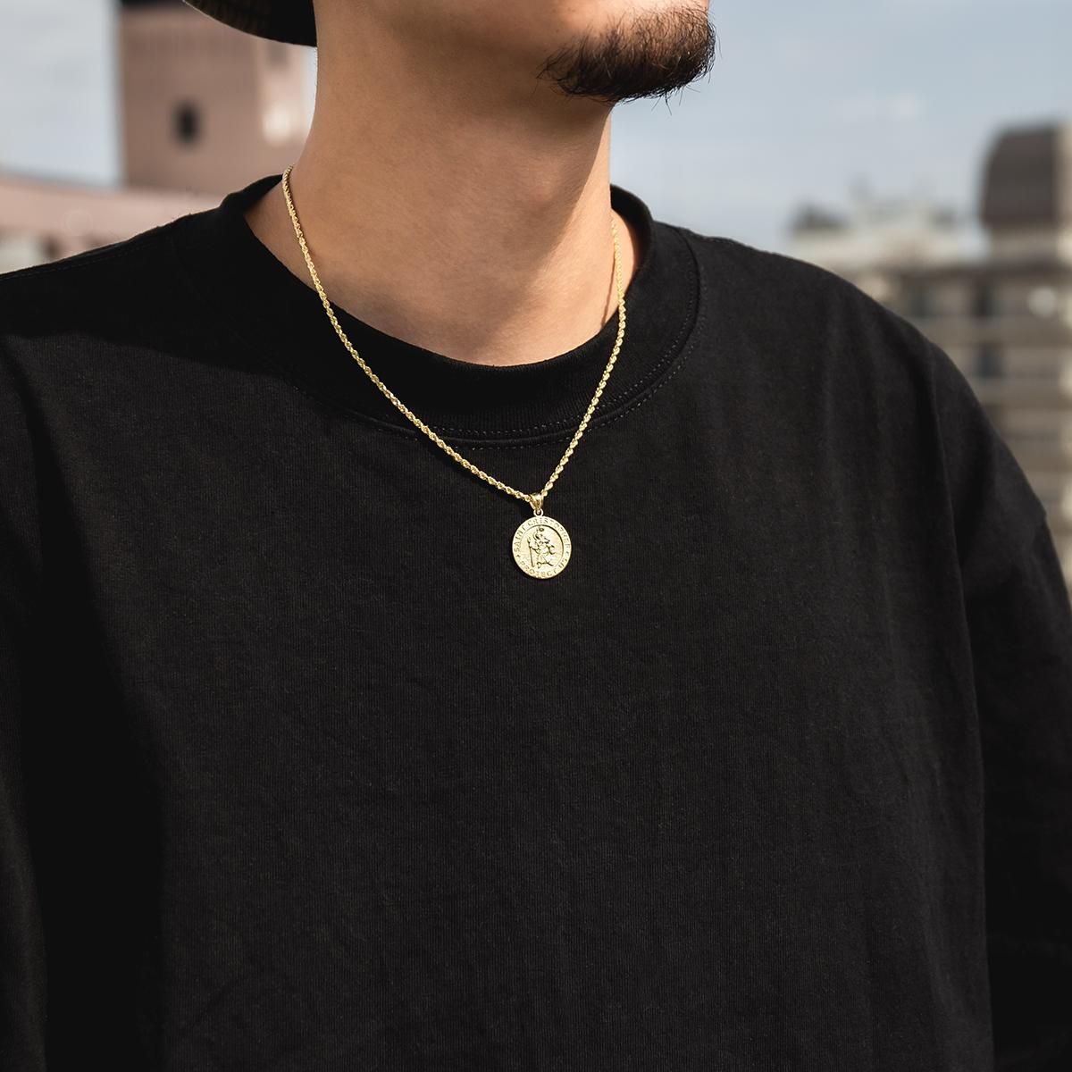 コインモチーフのイエローゴールドペンダント。中心にはクリストフォロスと言うキリスト教の伝説的な聖人がデザインされています。素材の魅力も楽しめる逸品です。
