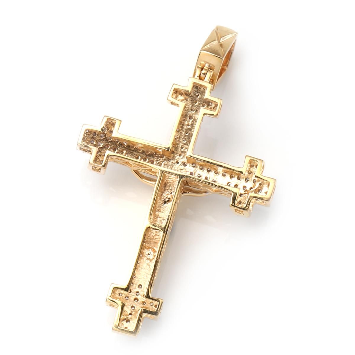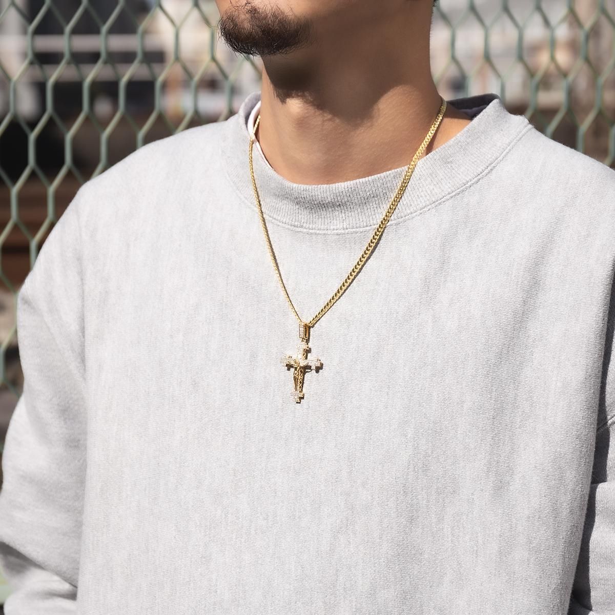 ジーザスをデザインしたクロスペンダント。クロス部分には0.50ctのダイヤモンドが敷き詰められています。イエローゴールドの色味とダイヤモンドの輝きを生かしたスタイリッシュなデザインが存在感を放ちます。