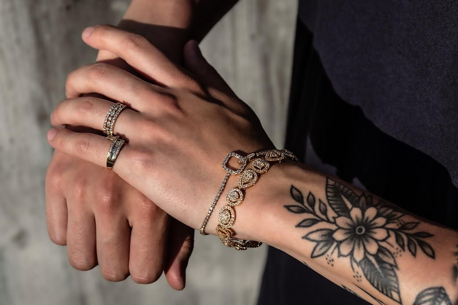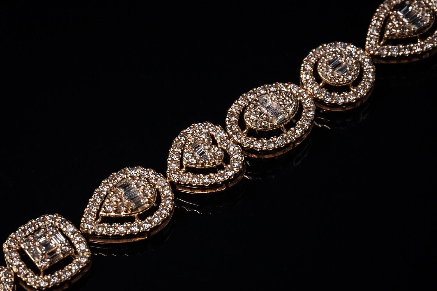 18Kイエローゴールドと全面にセッティングしたダイヤモンドの煌びやかな高級感とサークルやハートなどのデザインが連なる個性的なディテールが魅力の唯一無二なブレスレットです。