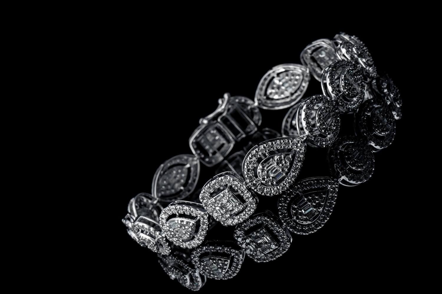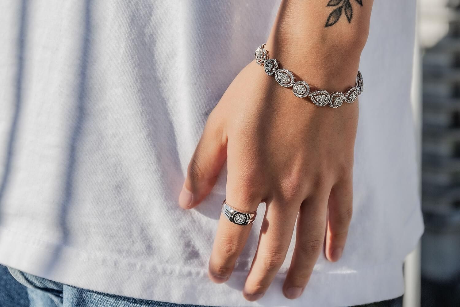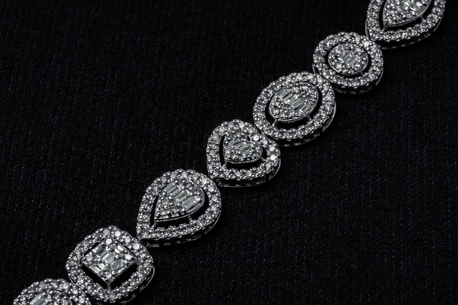 18Kホワイトゴールドと全面にセッティングしたダイヤモンドの煌びやかな高級感とサークルやハートなどのデザインが連なる個性的なディテールが魅力の唯一無二なブレスレットです。