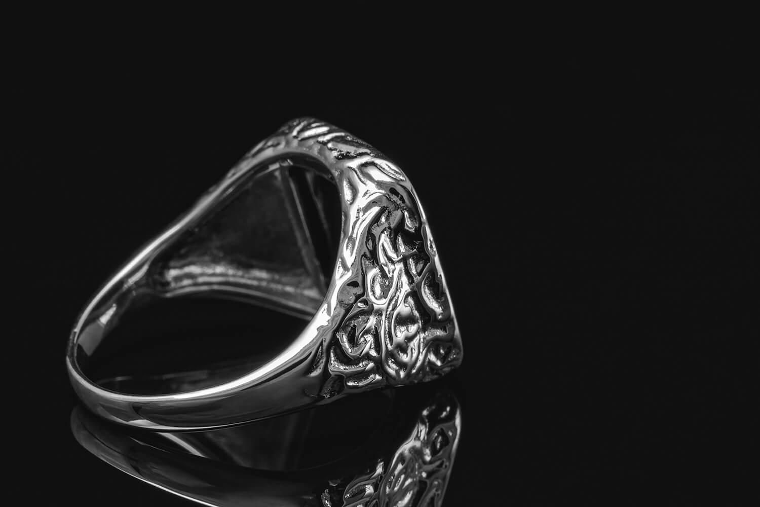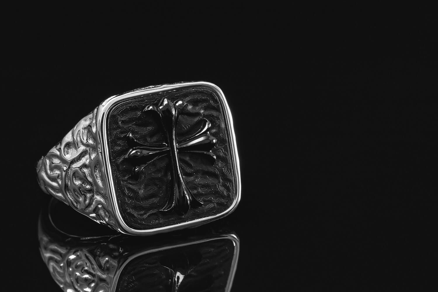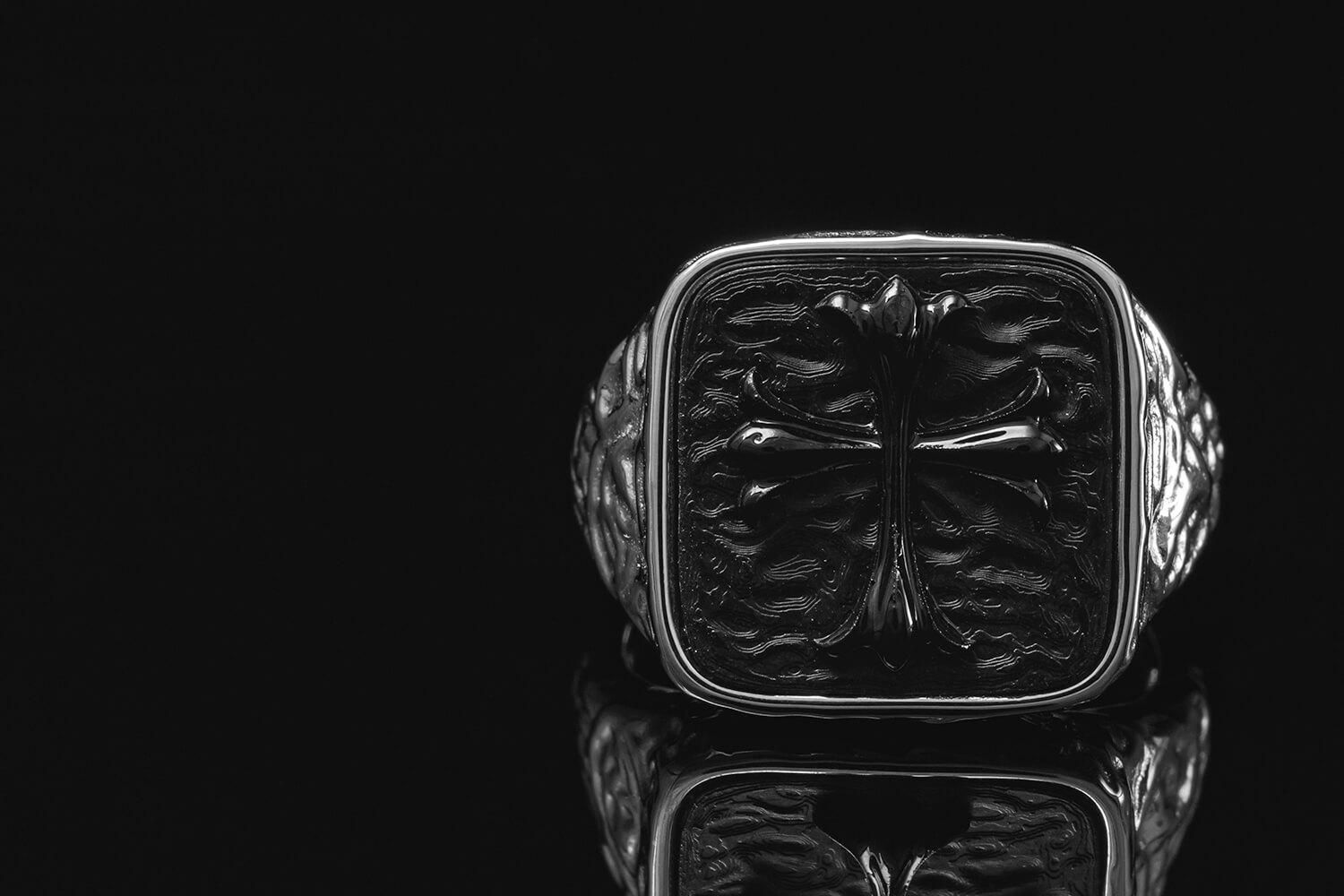 クロスデザインのシルバーリング。表面にレジンを使用している為、シックな雰囲気に仕上がっています。側面にもデザインを施しており、サイドからの見た目にも拘ったリングです。