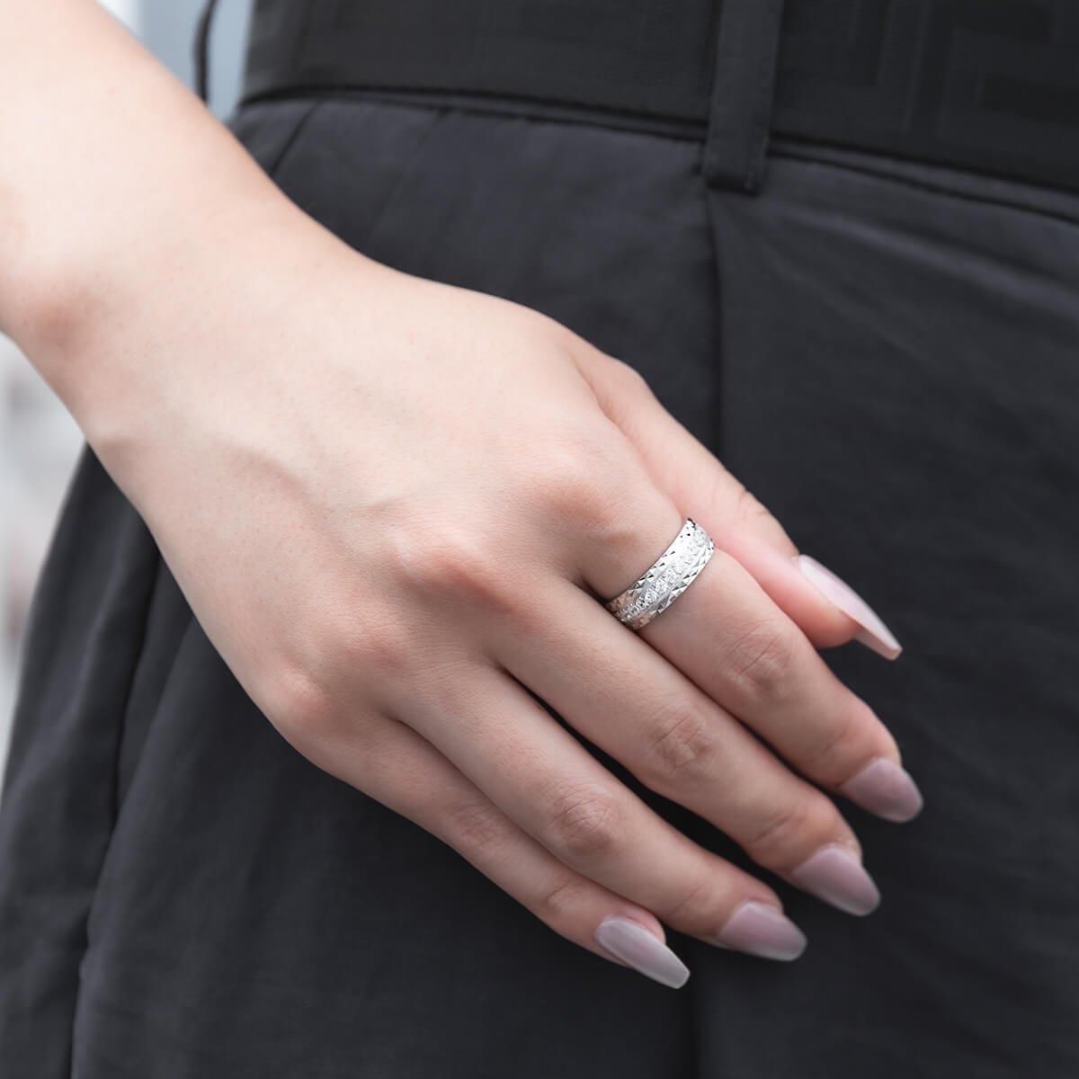 ジルコニアとカット加工を施した表面が美しく輝く、存在感抜群のリングです。