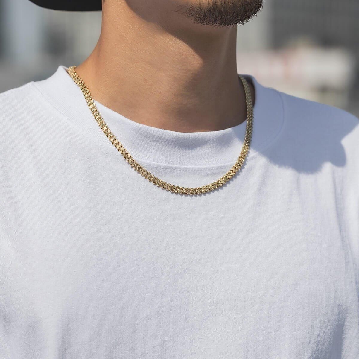 アメリカンジュエリー王道デザインのマイアミネックレス。全面にセットしたダイヤモンドが美しく輝きます。アメリカでは定番のデザインですが、日本ではなかなか手に入らないことも魅力のひとつです。マイアミネックレスならではのボリューム感に加えて、イエローゴールドとダイヤモンドの輝きがラグジュアリーな雰囲気を醸し出します。