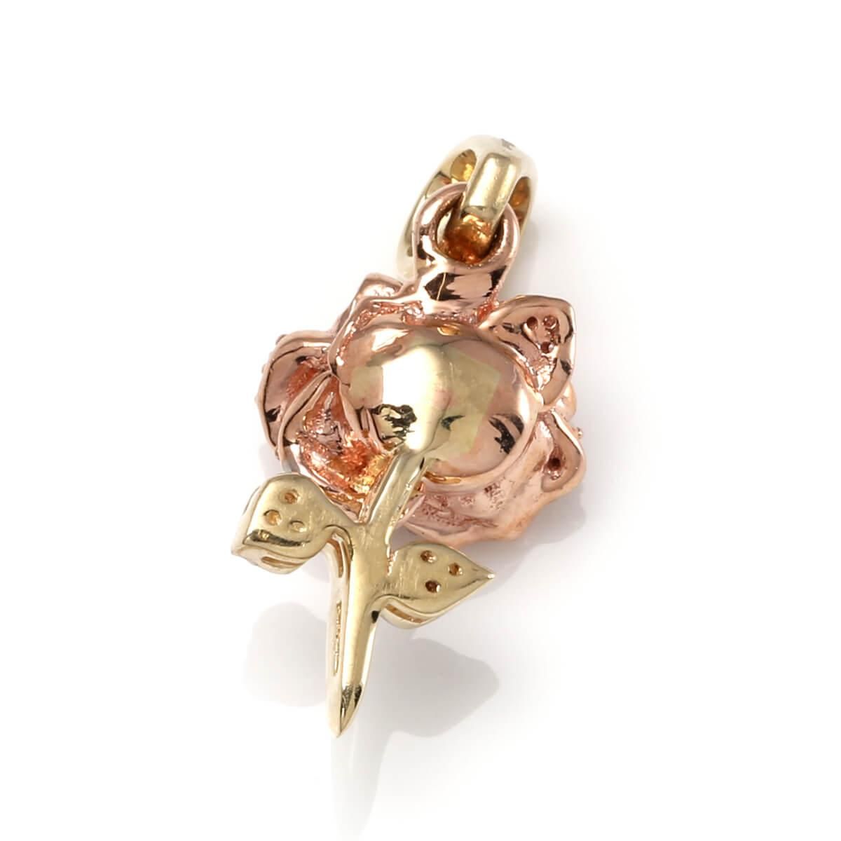 ローズデザインのダイヤモンドペンダント。イエローゴールドとローズゴールドを使用し、葉の部分にロジウム加工を施しホワイトゴールドカラーに仕上げた、お洒落なカラーリングのアメリカンジュエリーらしさが光るデザインです。花びらと葉にダイヤモンドをセットし、茎にはハイポリッシュ加工を施し、ダイヤモンドの輝きと素材の輝きを存分に楽しめる逸品です。