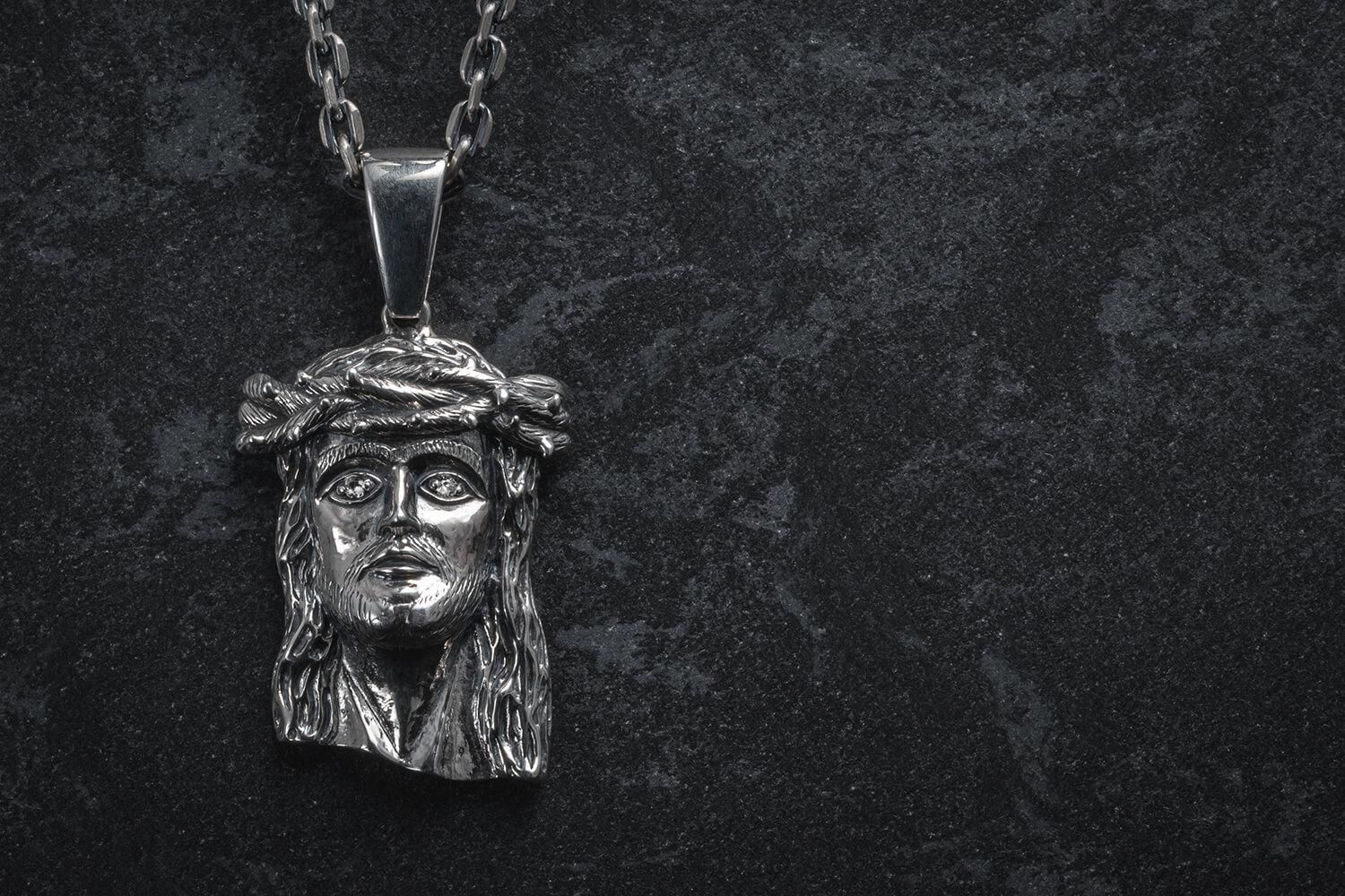 目の部分に2石のホワイトトパーズをセッティングしたジーザスフェイスのペンダント。茨の冠、バチカン、バックプレートなど、細かい部分もこだわったジュエリーに仕上げています。いぶし加工を施すことで、光沢と深い色合いが強調され、味わい深い印象を与えてくれます。