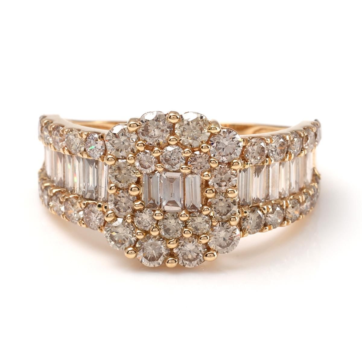 ダイヤモンドを隙間なく敷き詰めたイエローゴールドリング。表面にセットしたラウンドカットとバゲットカットの2種類のダイヤモンドが上品な輝きを放ち、高級感溢れるリングに仕上がっております。18Kの鮮やかさとダイヤモンドの迫力に釘付けになること間違い無しです。