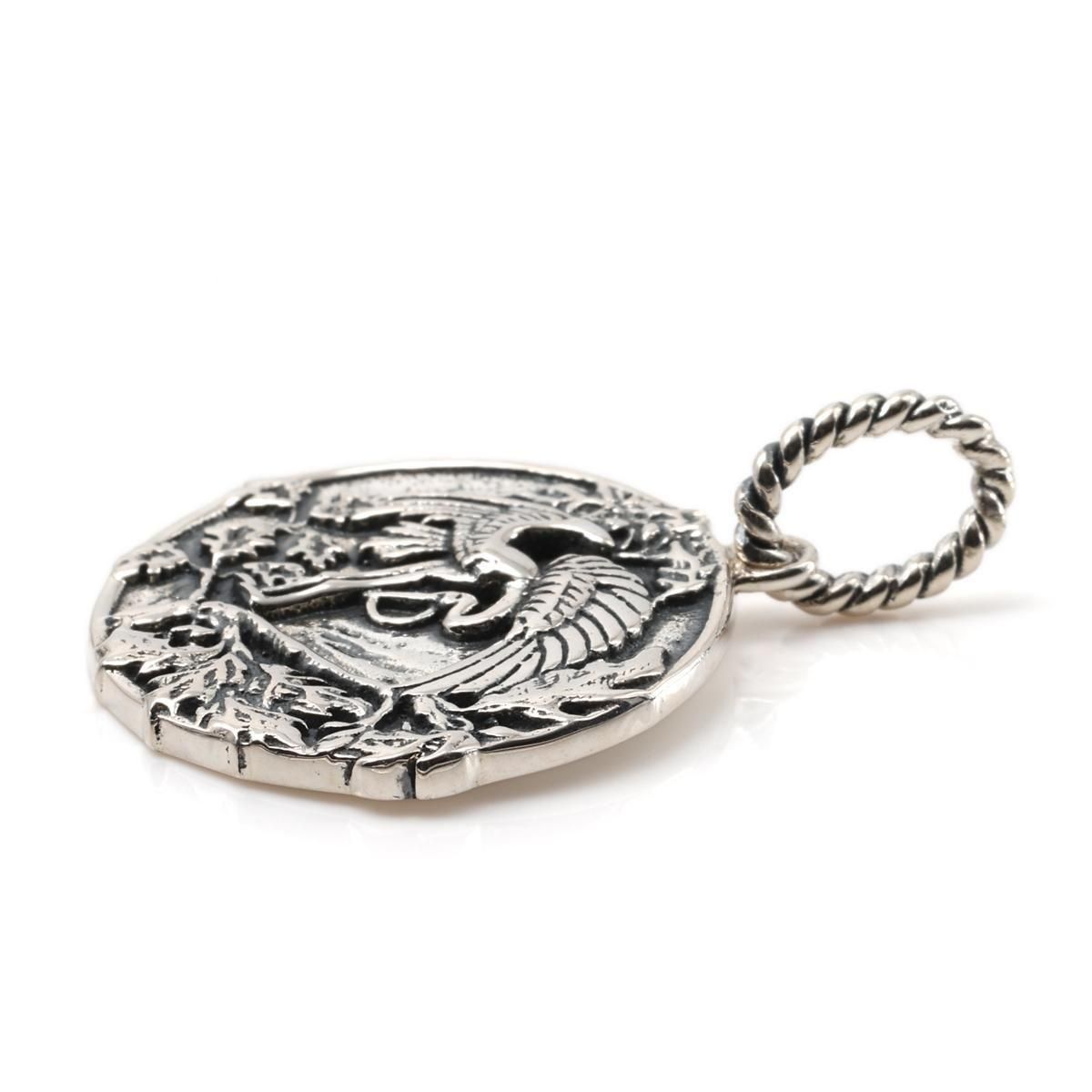 縁起の良い鶴をデザインしたシルバーペンダント。いぶし加工を施すことで陰影を出し、光沢と深い色合いが強調され、味わい深い印象を与えてくれます。様々なファッションにも合わせやすく、程良いアクセントを与えてくれるジュエリーです。