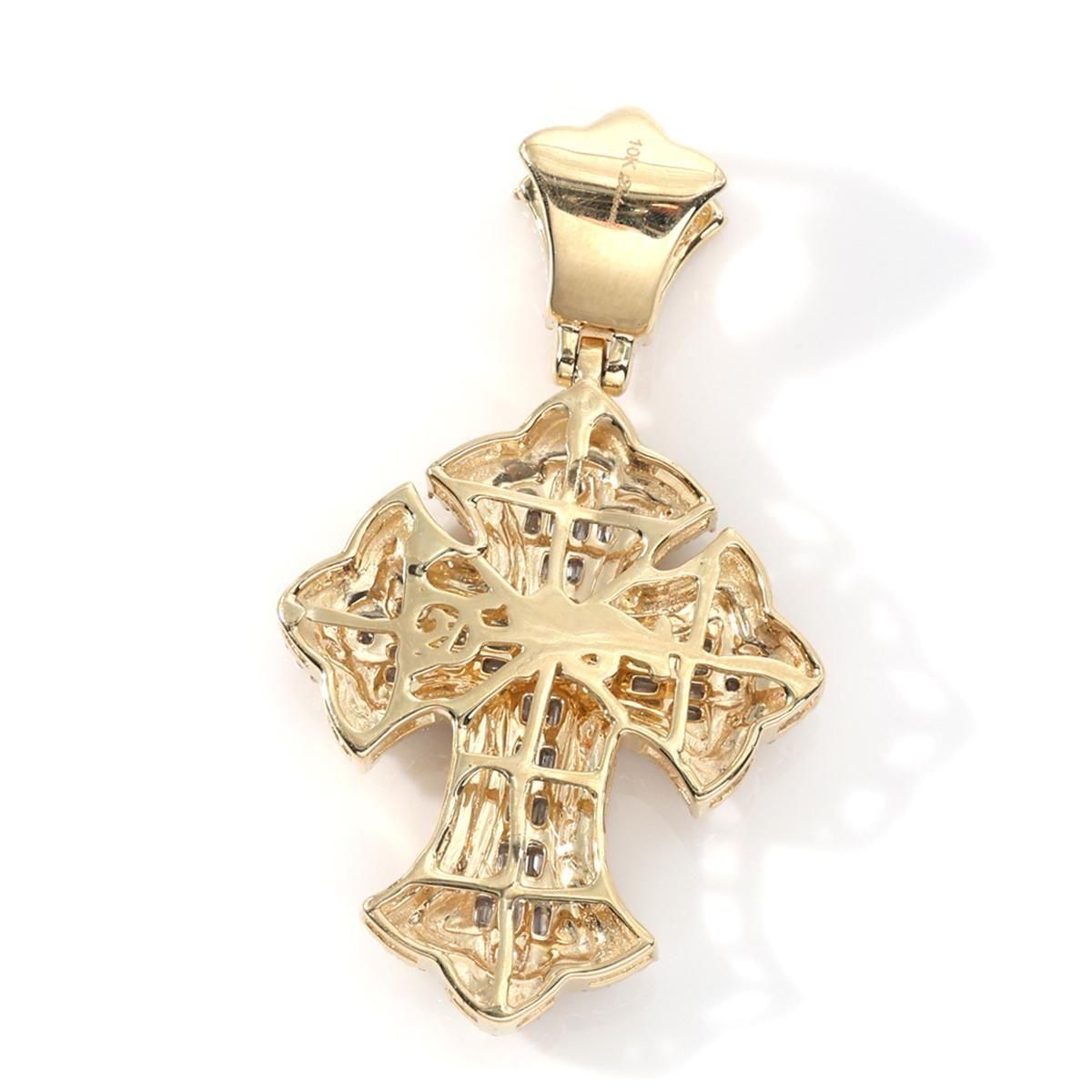 定番のクロスデザインペンダント。周りをラウンドカット、中をバゲットカットのトータル0.75カラットものダイヤモンドを施しており、デザインも輝きも申し分ない、インパクト抜群のペンダントです。
