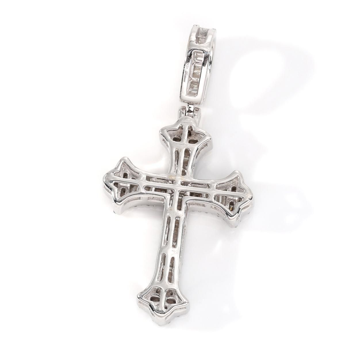 デザイン性の高いクロスペンダント。縁をラウンドカット、中をバゲットカットのダイヤモンドを施している為、より強い輝きを放ちます。ボリュームのあるデザインと、ダイヤモンドの輝きが胸元をしっかり主張し、華やかに飾ってくれます。