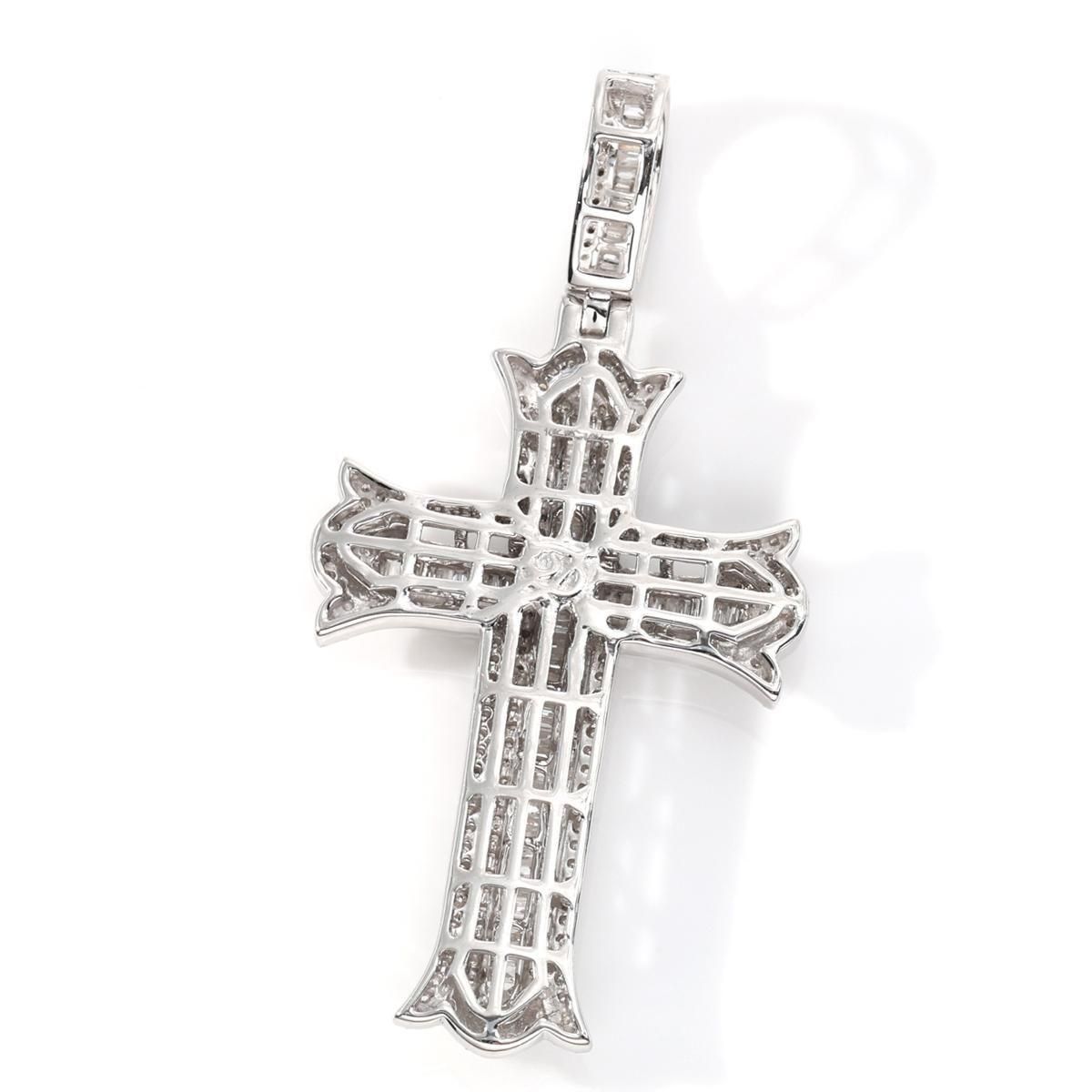 定番のクロスデザインペンダント。表面にラウンドカットとバゲットカットの2種類のダイヤモンドをセットしており、立体的な造りで滑らかな曲線が特徴な為、サイドからのシルエットが美しいフォルムのデザインです。デザインも輝きも申し分ない、インパクト抜群のペンダントです。