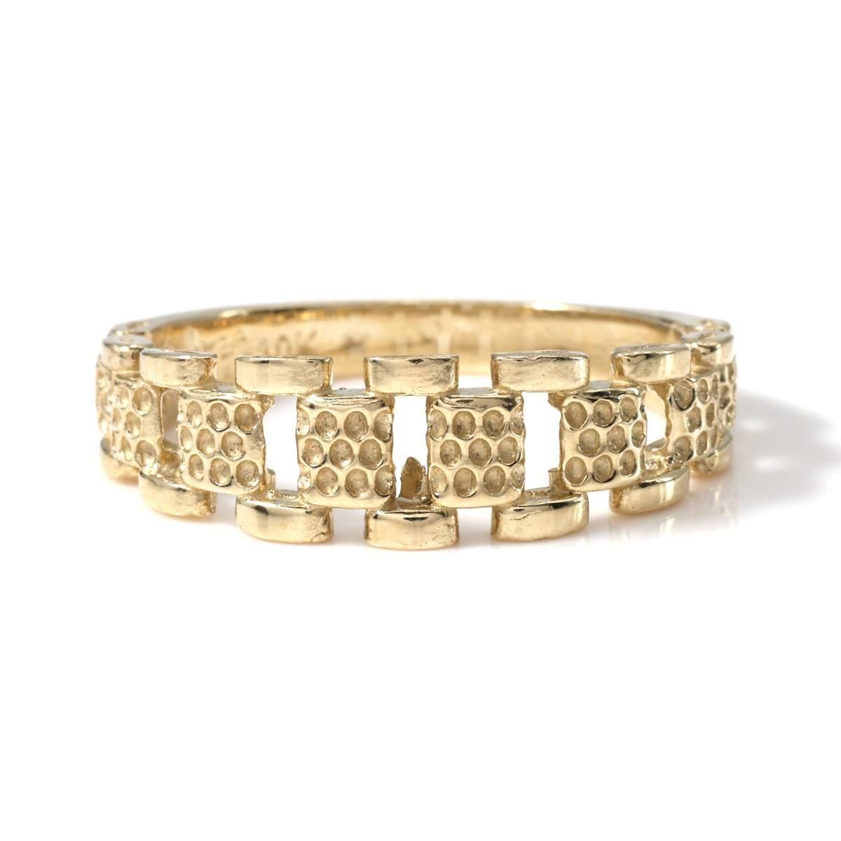 時計のブレスレットデザインのリング。ジルコニア等の装飾をせず、素材の輝きを存分に楽しめる、シンプル且つ存在感のあるデザインです。上下のラインに光沢が上品なハイポリッシュ加工を施しています。