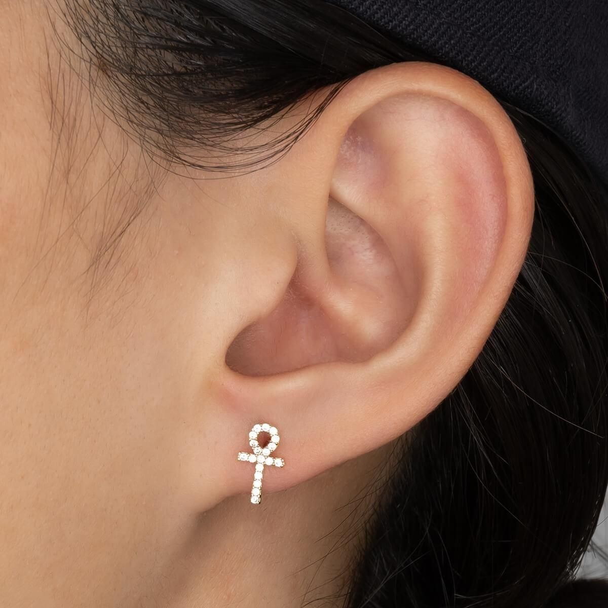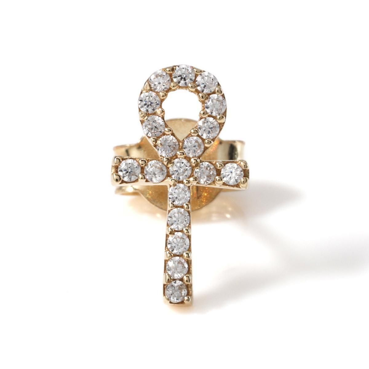 全面にジルコニアをセットしたアンククロスデザインのゴールドピアス。シャープでスタイリッシュなデザインなので、様々なスタイルにも合わせやすく、さり気なく耳元にアクセントを取り入れる事ができるピアスです。