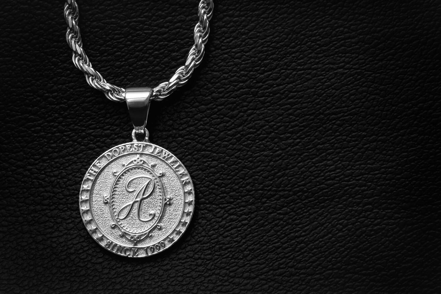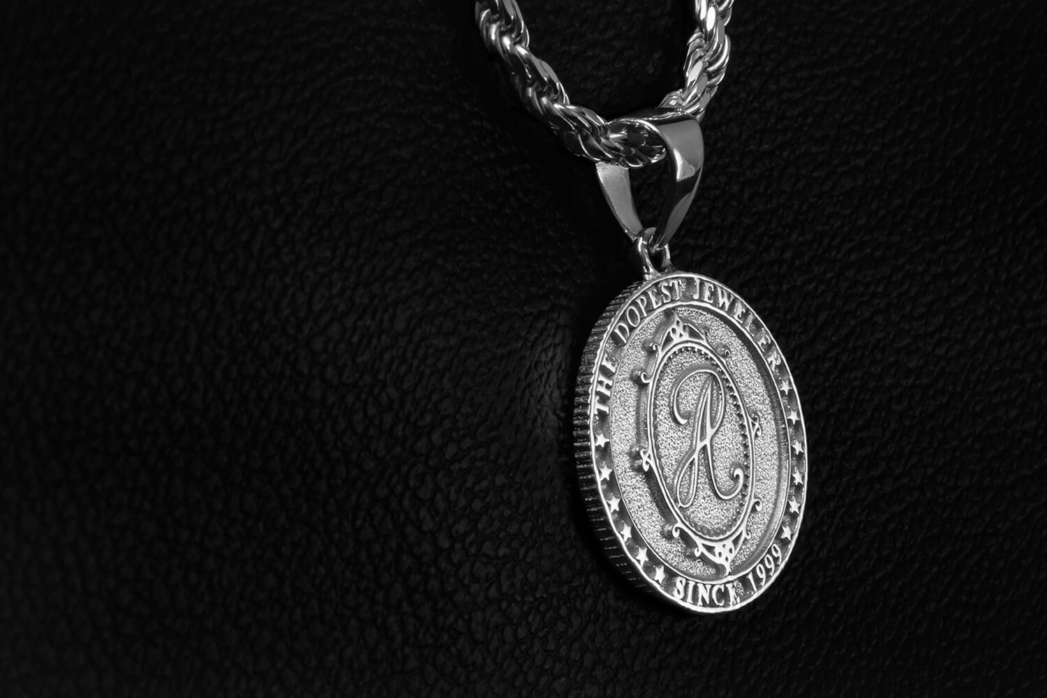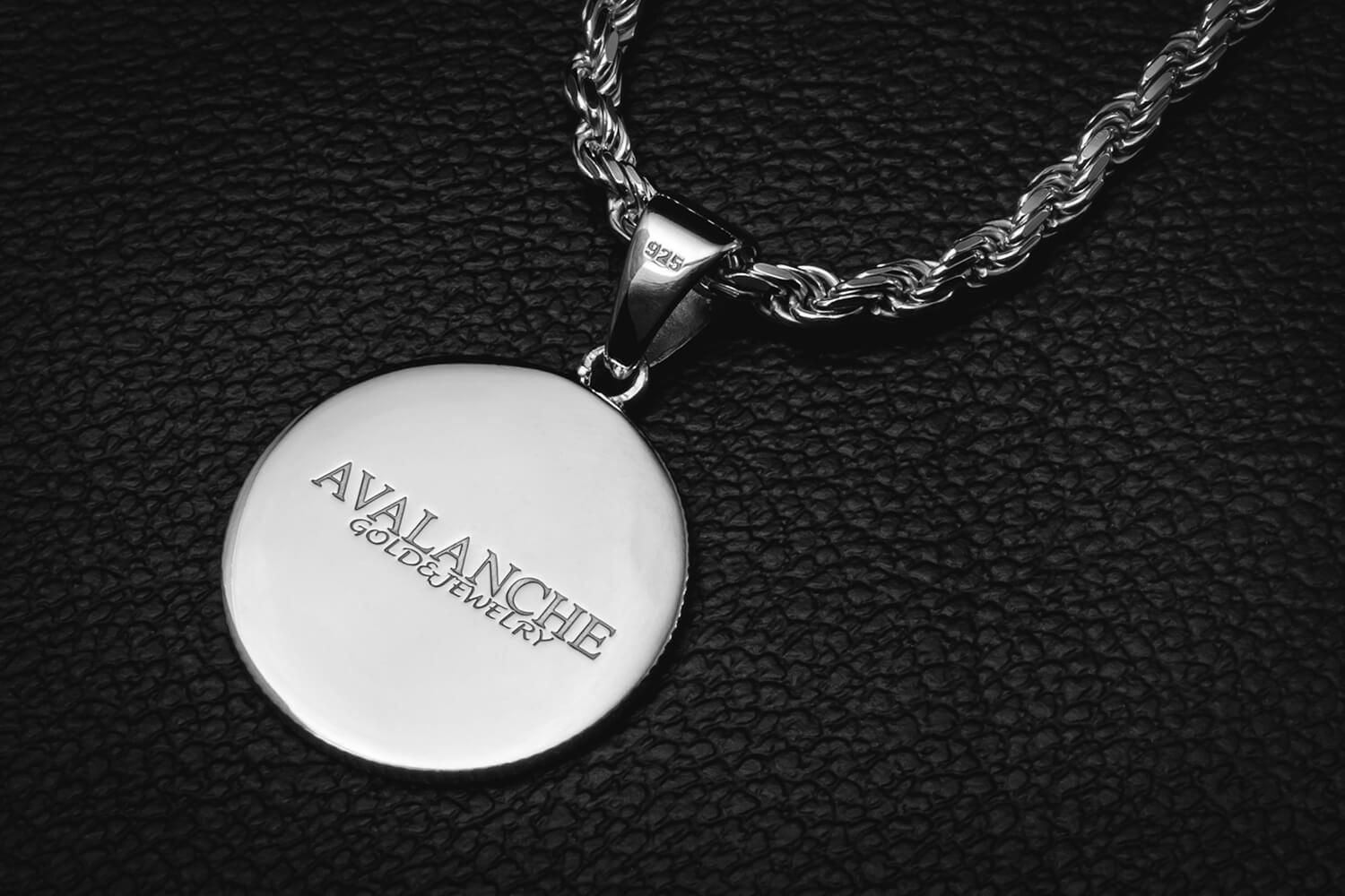 アヴァランチオリジナルロゴを中央にセットしたメダルデザインのペンダント。外周には"THE DOPEST JEWELER"、"SINCE 1999"とスターデザインが刻まれています。裏面にもロゴが刻印され、サイドには本物のメダルの様なギザギザをデザインした、細かい部分にまでこだわったジュエリーになっています。ベーシックなメダル型なので、どんなファッションにも合わせられるペンダントです。